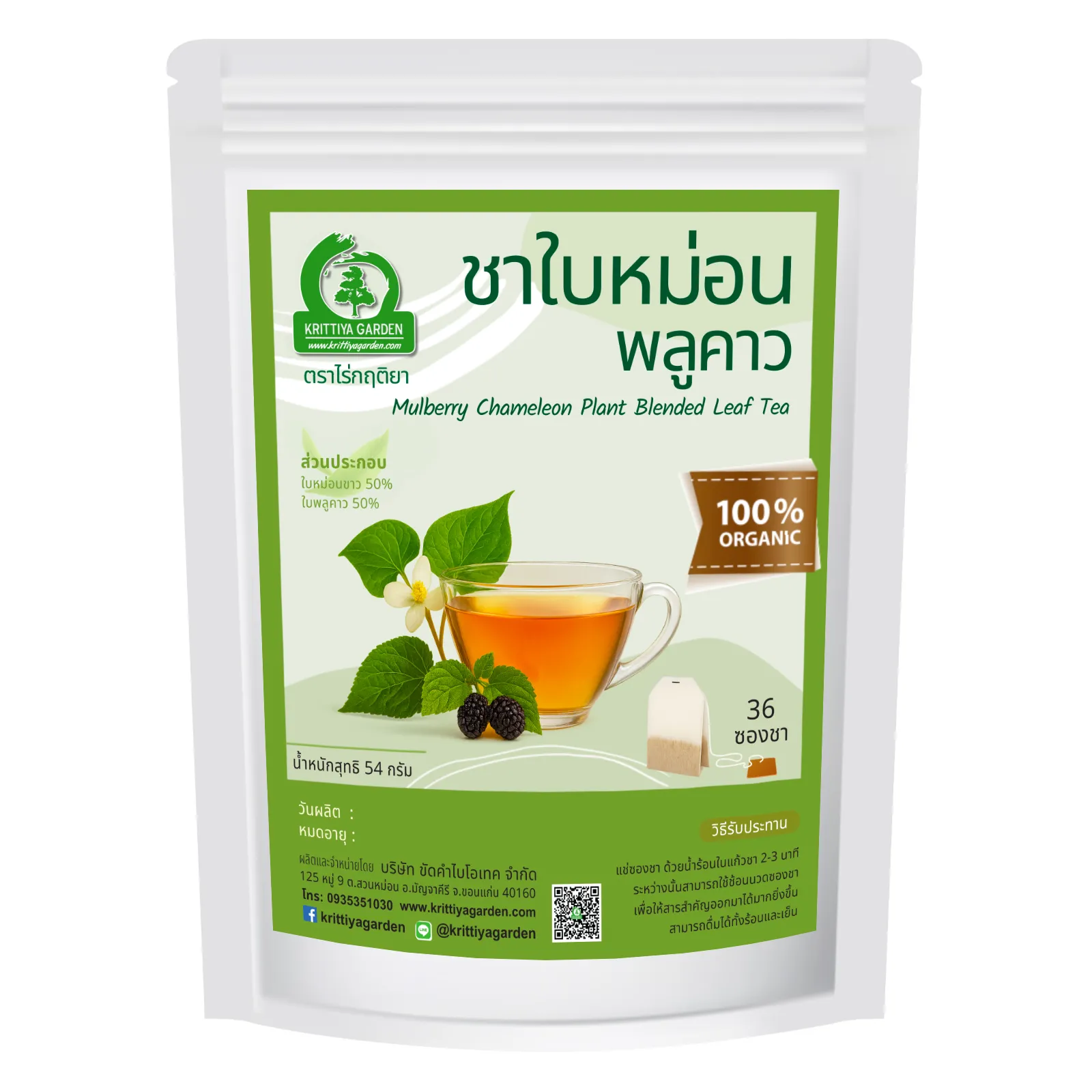 ชาใบหม่อนผสมพลูคาว ตราไร่กฤติยา (Mulberry Chameleon Plant Blended Leaf Tea) ผลิตจากใบหม่อนขาว 50% และใบพลูคาว 50% ไม่มีส่วนผสมจากสมุนไพรชนิดอื่น ไม่มีน้ำตาลและคาเฟอีน บรรจุในซองอลูมิเนียมฟอยด์ซิปล็อคที่ช่วยเก็บรักษาคุณภาพของชาได้ยาวนาน มีให้เลือก 2 ขนาดคือ ขนาด 15 ซองชา และ 36 ซองชา สะดวกต่อการพกพาและใช้งานในทุกสถานการณ์