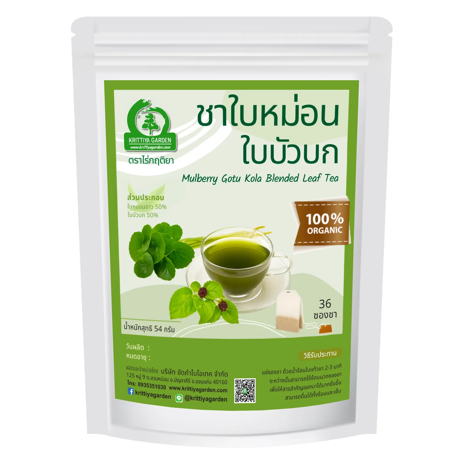 - ชาใบหม่อนผสมใบบัวบก คัดพิเศษ จาก ไร่กฤติยา